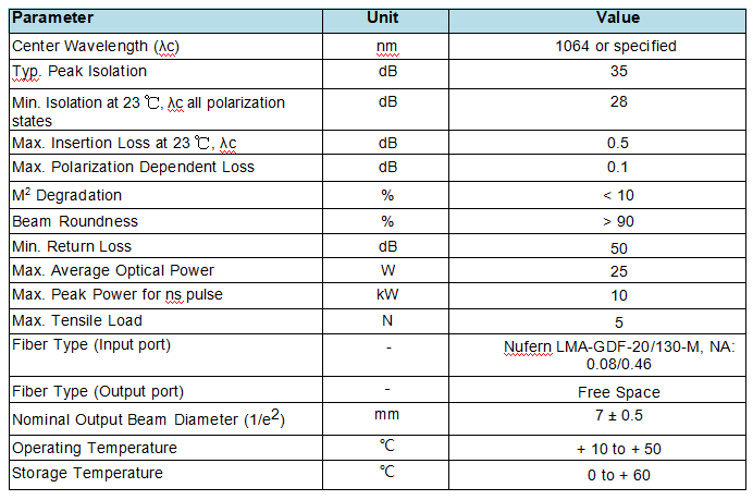 中心波长:1064nm或指定,插损:0.5dB,回波损耗:50dB